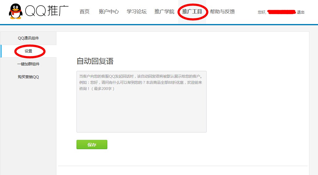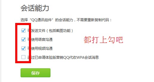 第二步:登陸之后,點擊導航中的“推廣工具”,點左側的第二個“設置”,按下圖所示,全部打勾。這個必須設置,不設置,不能臨時會話,就會顯示“未啟用”。這一步是關鍵,必須設置。先看服務有沒被停用:如停用了,請“啟用服務”