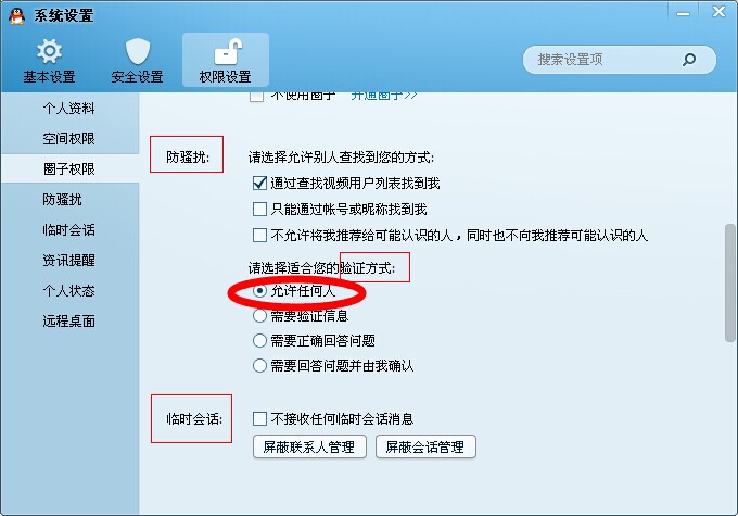 第五步,在“權限設置”——“臨時會話”——把“不接收任何臨時會話”的勾去掉。