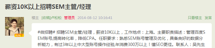 從接觸SEO這行開始,在論壇便見到很多人由于轉行做百度競價而兜售高等級賬號,那是不是說明百度競價專員比SEOer更有前途呢?事無絕對,不管做哪一行,我們都要做精做透。我們都是知道,百度競價是SEM的一種網絡推廣方式。SEM全稱為Search Engine Marketing,即為搜索引擎推廣的意思。專門從事百度SEM的人員,又稱為百度競價專員。百度競價專員一個月有1萬月薪!這個不是蘇州網絡公司瞎說的,如果你的專業技能過硬,是可以拿到1萬月薪的工資。有圖有真相,這是之前盧松松在QQ群里代發的百度競價專員的信息。